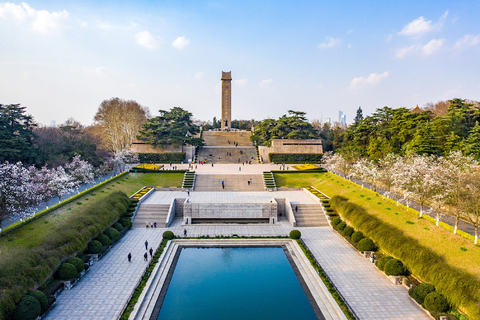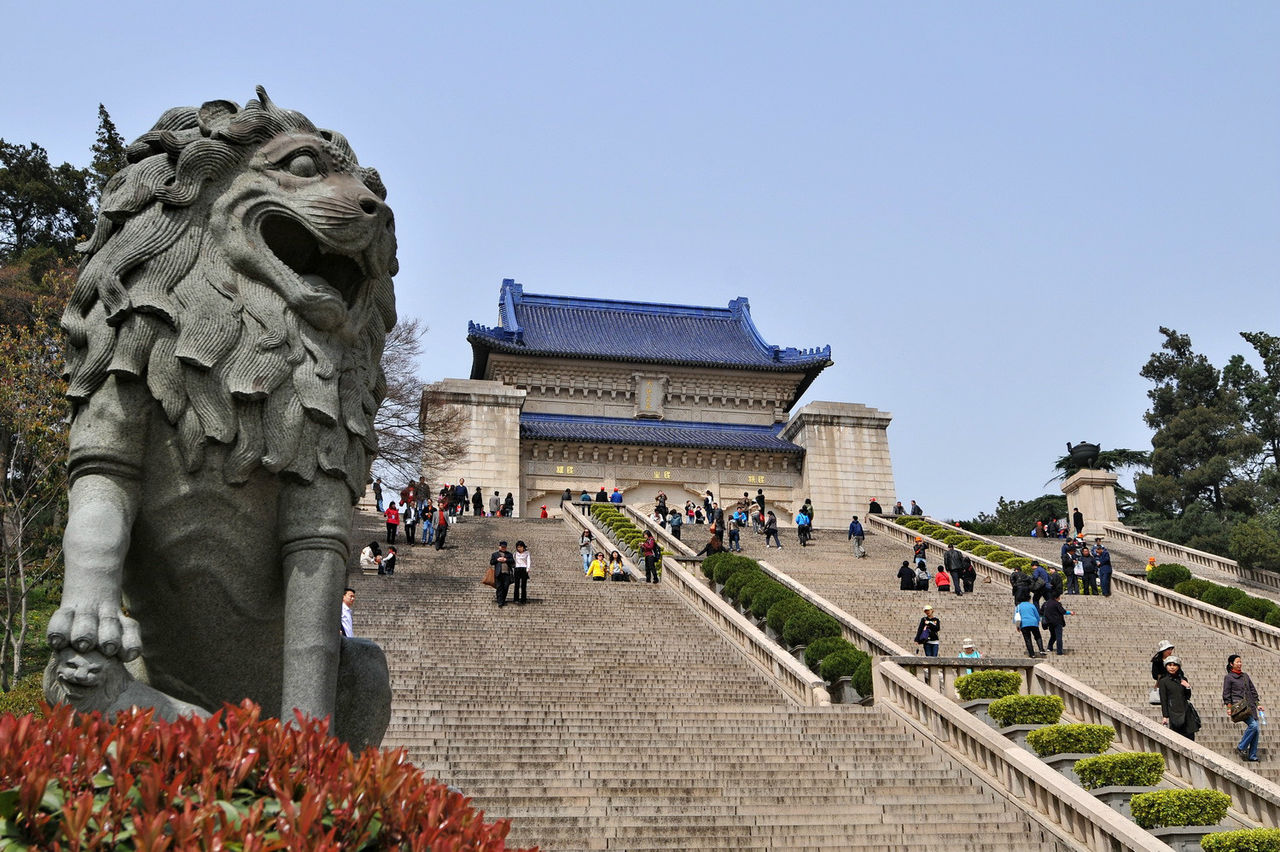 下午:游玩国家5A级景区【中山陵】(周一祭堂维护不开放,只能走到陵门为止;周二-周日 08:00-17:00开放)。中山陵位于南京东郊的钟山风景区内,东毗灵谷寺,西邻明孝陵。整个建筑群依山势而建,由南往北排列在一条中轴线上,墓地全局呈“警钟”形图案。中山陵包括博爱坊、墓道、陵门、碑亭、祭堂和墓室等建筑。陵墓入口广场有高大的花岗岩牌坊,上面是“博爱”两个金字。往北走过博爱坊,就是近400米长的墓道,共有392级石阶,落差73米。沿墓道前行到达陵门,顶上是青色的琉璃瓦,门额上写着“天下为公”四个大字。再进为碑亭,继续向前直到祭堂。到达中山陵顶需要爬长长的台阶,每过一段台阶会有一块平台以便歇脚。这里有一个设计上的视觉手法,使你自下而上看时,只见台阶不见平台,自上而下看时,只见平台不见台阶,你不妨留心一观。在第五个平台上有两个大鼎,其中一个鼎壁上还留有日军侵华时造成的炮弹孔。山顶高峰上便是中山陵的主体建筑——祭堂,为仿宫殿式的建筑。中门顶上嵌有“天地正气”竖额。祭堂中央是由白色大理石雕刻的坐像,底座镌刻六幅浮雕。祭堂内有两重铜制墓门,门内则为圆形墓室,中央是长形墓穴。墓室不对外开放。在陵墓建筑群外,还环绕着音乐台、光化亭、流徽榭、仰止亭、中山书院、藏经楼、行健亭等纪念性建筑。