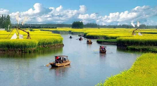 13:00 游览【千垛油菜花】(游玩时间约120分钟):位于兴化市缸顾乡,以千岛样式形成的垛田景观享誉全国。据考证,750年前,缸顾乡农民在水中取土堆田,整齐如垛,并在上面种植农作物,才演变成现今的生态景致。每年的清明前后,在辽阔的水面上,千姿百态的垛田形成了上千个湖中小岛,岛上开满金灿灿的油菜花,在水面上形成一片金黄色“花海”,一望无际,令人叹为观止。这里河港纵横,菱藕飘香,块块隔垛宛如漂浮于水面岛屿,有“万岛之国”的美誉。每年春季,油菜花开,蓝天、碧水、“金岛”织就了“河有万湾多碧水,田无一垛不黄花”的奇丽画面。泛舟其中,如入迷宫,浓郁花香让人迷醉,旖旎风光令人流连忘返。